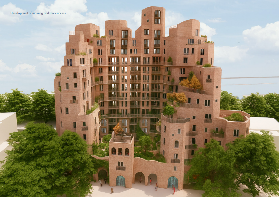 The proposed façade design uses subtle variation, natural materials and a stepping form to create a welcoming and picturesque appearance for residents and the wider context. The principal façade material would be a red toned brick with a high level of texture and tonal variation.
