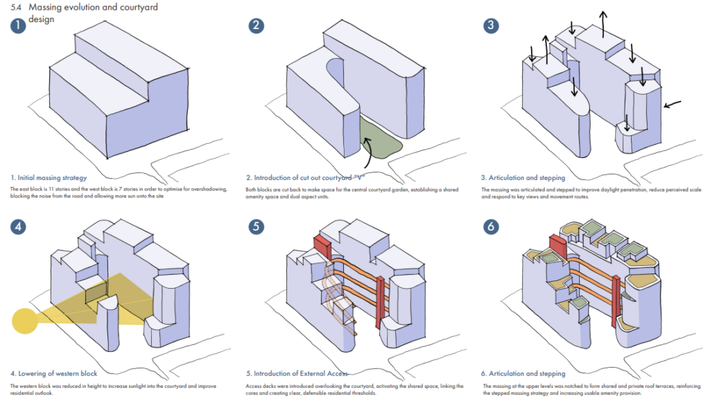 The stepping strategy between the eastern and western elements (two to seven storeys) reduces perceived scale from Grahame Park Way,limits overshadowing of neighbouring plots and safeguards future development potential.