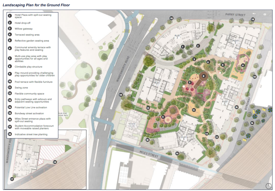 Proposals for public realm improvements, as pictured below, represent an improvement compared to the previous now-expired consent from the 2010s; however, these proposals would form part of the Nine Elms Linear Park, which totals 14 acres and runs from Vauxhall through Nine Elms to Battersea Power Station.